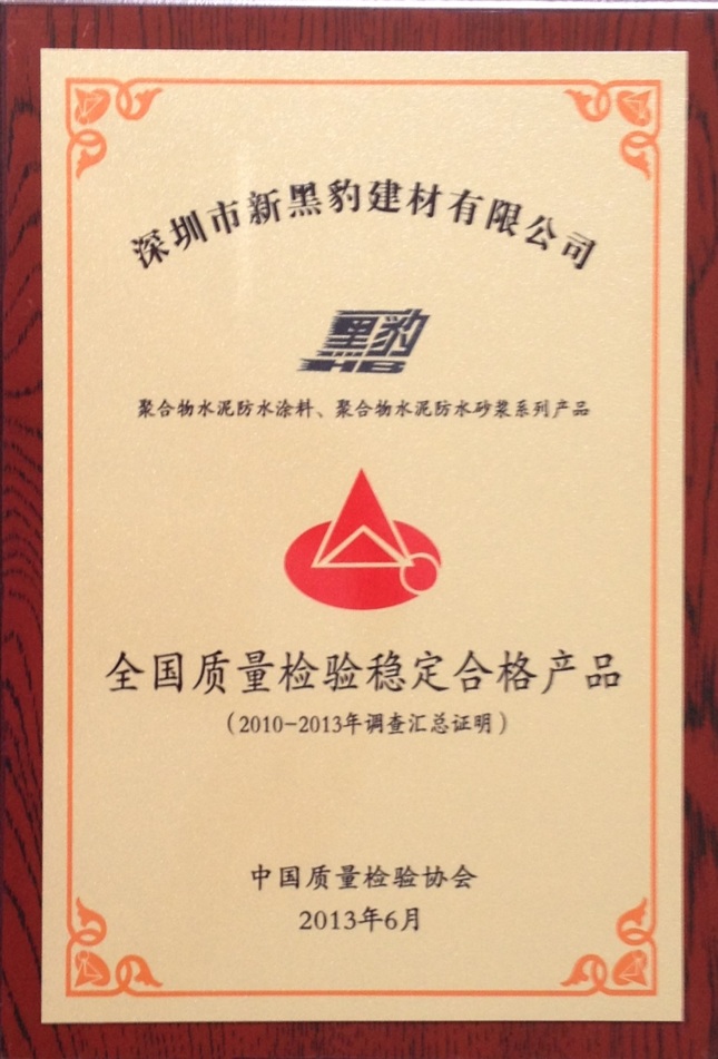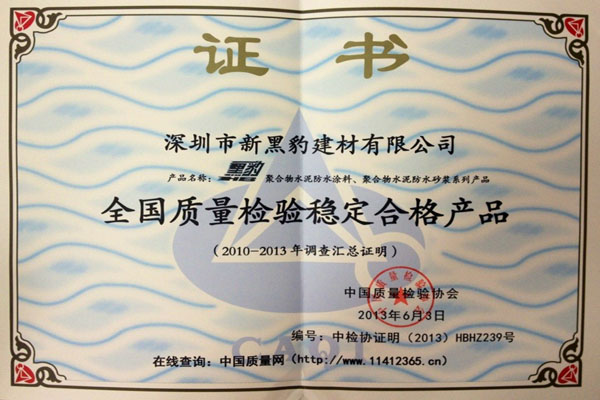 熱烈慶賀我深圳市新黑豹建材有限公司所生產(chǎn)的“黑豹”牌系列產(chǎn)品被評為全國質(zhì)量檢驗(yàn)穩(wěn)定合格產(chǎn)品,并獲得了“全國質(zhì)量檢驗(yàn)穩(wěn)定合格產(chǎn)品”的證書,此調(diào)查匯總和專題宣傳活動是由中國質(zhì)量檢驗(yàn)協(xié)會組織開展的“全國質(zhì)量檢驗(yàn)穩(wěn)定合格產(chǎn)品”,并由中國質(zhì)量檢驗(yàn)協(xié)會根據(jù)調(diào)查匯總和審核評出的結(jié)果。另外,我公司也收到由中國質(zhì)量檢驗(yàn)協(xié)會贈送的“全國質(zhì)量檢驗(yàn)穩(wěn)定合格產(chǎn)品”的專業(yè)防偽標(biāo)識,此標(biāo)識可貼在包裝桶上面,消費(fèi)者可通過電話或者短信進(jìn)行防偽查詢。(此防偽標(biāo)識暫未啟用,若啟用,我公司將另行通知)