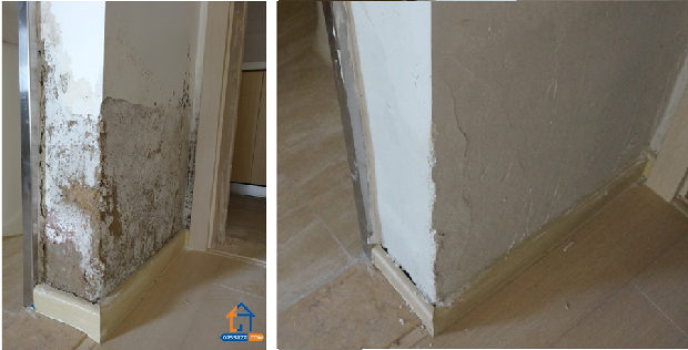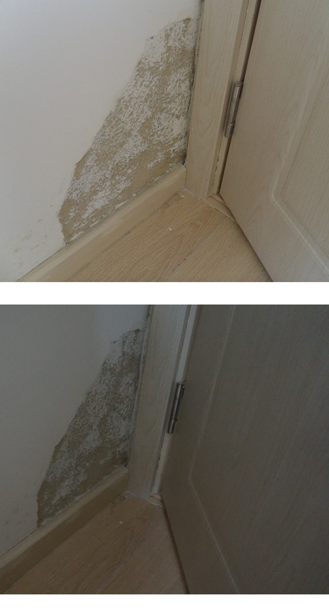 記者在現(xiàn)場看到, 410號房和718號房同樣位置,墻壁重新修補(bǔ)粉刷的痕跡明顯,2912房間墻角處的剝落仍未修補(bǔ),2916房未見明顯的滲水痕跡。中海相關(guān)負(fù)責(zé)人解釋,410號房的墻壁問題,是由于該墻壁外接露臺,前期施工中露臺與墻壁間存在縫隙導(dǎo)致滲水,718房間的滲水,是因為供水管道接口存在問題;而2912墻角處的剝落,目前尚未查清究竟是供水管道滲水,還是建筑工人用水不當(dāng)導(dǎo)致墻壁被浸泡。